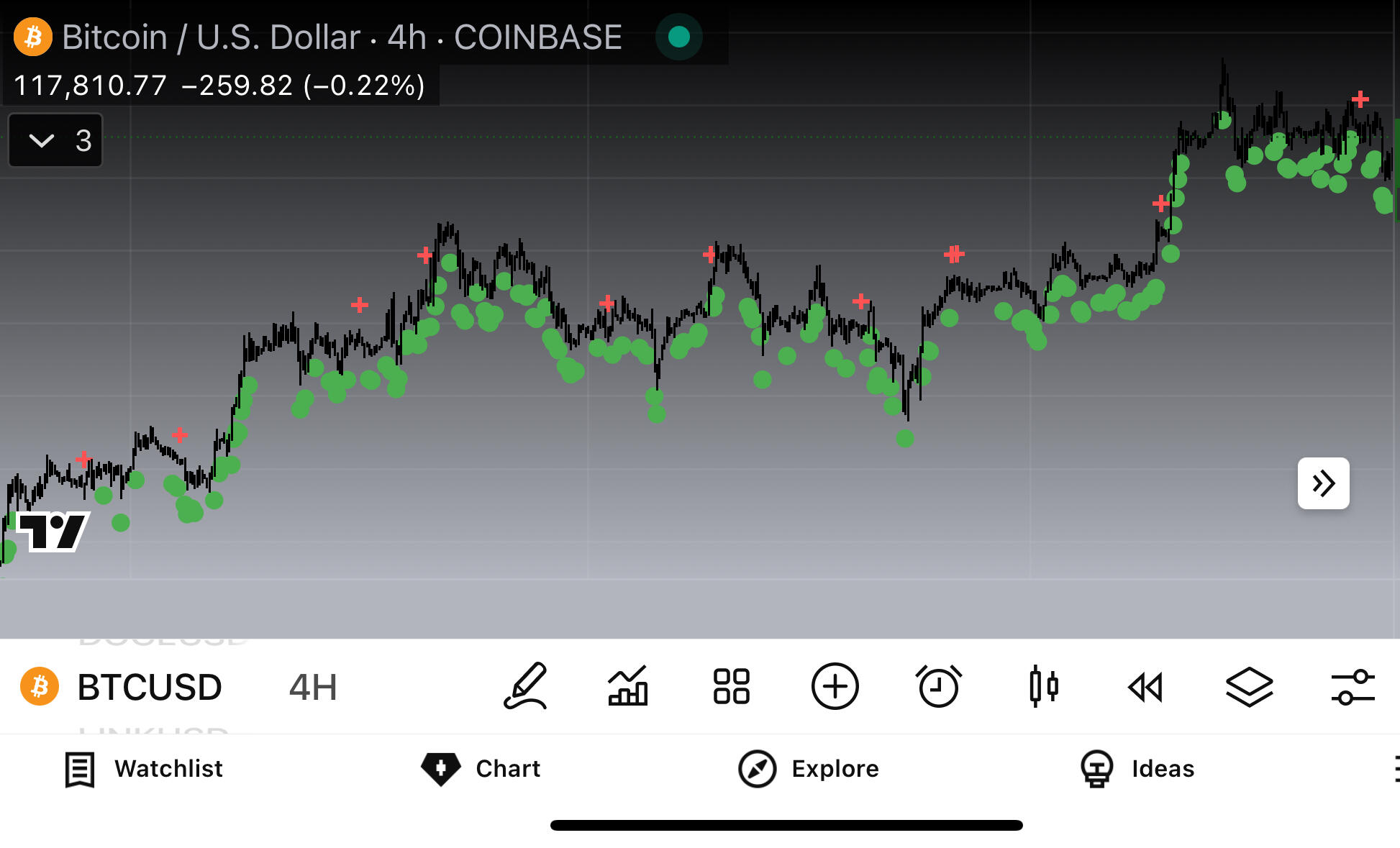 Green dots represent past forecasts that matched candle direction at close, while red crosses mark those that did not. These are displayed as they occurred — without adjustment.