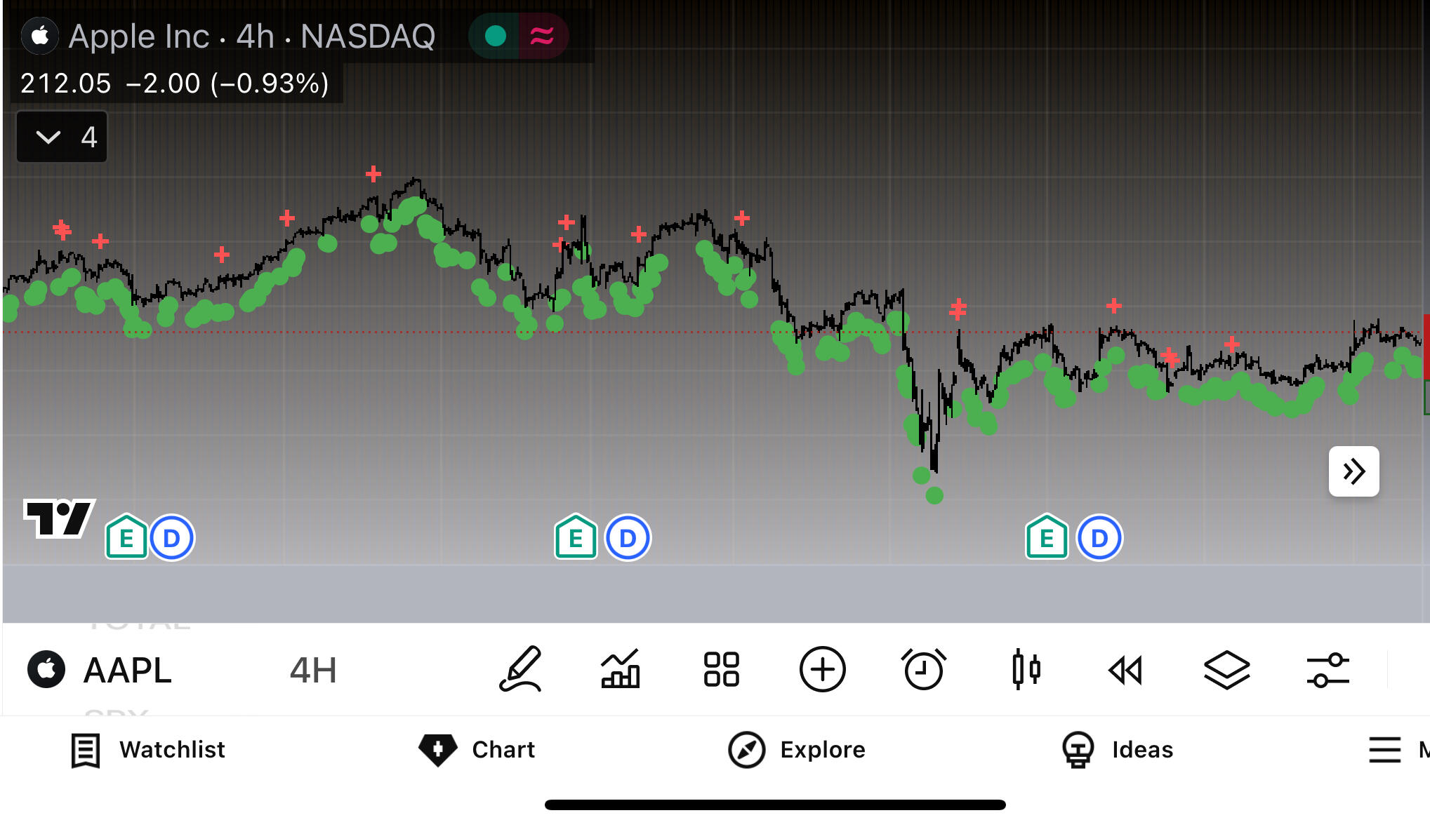 Green dots represent past forecasts that matched candle direction at close, while red crosses mark those that did not. These are displayed as they occurred — without adjustment.