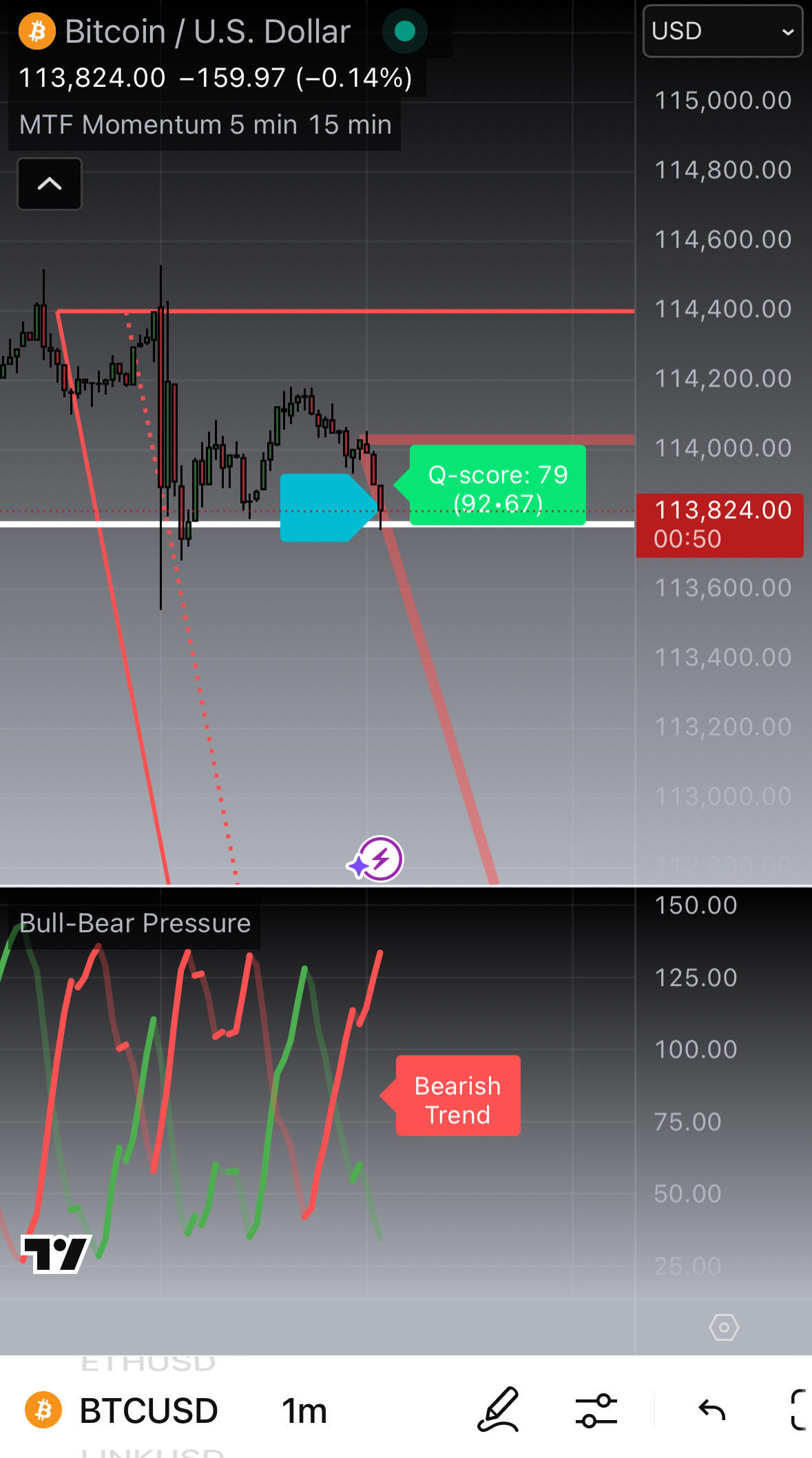 Real-time momentum forecasts that update on the current candle, lock at close, and never repaint. Every forecast is logged — win or lose.