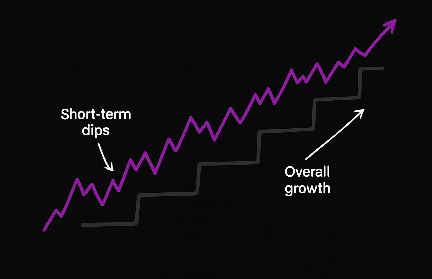 Most people expect a stock that grows 10% in a year to move in a straight upward line. In reality, the path is much less predictable. Prices move up and down along the way, often gaining 2–3% one week and then giving most of it back the next. Despite the back-and-forth movement, the overall direction can still be upward.A useful way to picture this is like a staircase. Instead of flat steps, imagine the edges of the stairs are tilted and uneven. Each step may rise and dip as it goes, but the staircase itself still climbs higher over time.From this perspective, the key idea isn’t to focus on every single small movement, but rather to recognize the overall direction of progress — the tilt of the staircase. Within that larger climb, there are also smaller shifts where momentum slows down or picks back up, creating short stretches that either add to or briefly pause the growth.Understanding this “stair-step” view of the market helps put short-term changes into context. The day-to-day or week-to-week ups and downs are part of the normal process, while the long-term direction is what defines the bigger picture of growth.Predator helps you visualize this concept by highlighting the dominant direction of movement, making it easier to separate short-term noise from the broader trend and see how smaller shifts fit into the bigger momentum picture.
